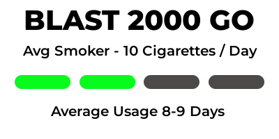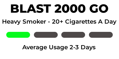Based on the nicotine consumption of a heavy smoker, about 20 cigarettes a day, the BLAST 2000 Go with 2ml of 20mg/ml nic salts would last about 2 to 3 days.