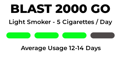 Based on the nicotine consumption of a light smoker, about 5 cigarettes a day, the BLAST 2000 Go with 2ml of 20mg/ml nic salts would last about 12 to 14 days.