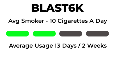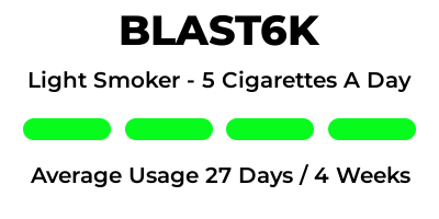 Based on the nicotine consumption of a light smoker, about 5 cigarettes a day, the BLAST6K with 12ml of 20mg/ml nic salts would last about 4 weeks or 27 plus days.