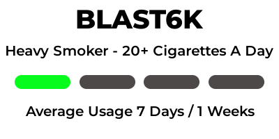 Based on the nicotine consumption of a heavy smoker, about 20 cigarettes a day, the BLAST6K with 12ml of 20mg/ml nic salts would last about 1 week or 7 plus days.