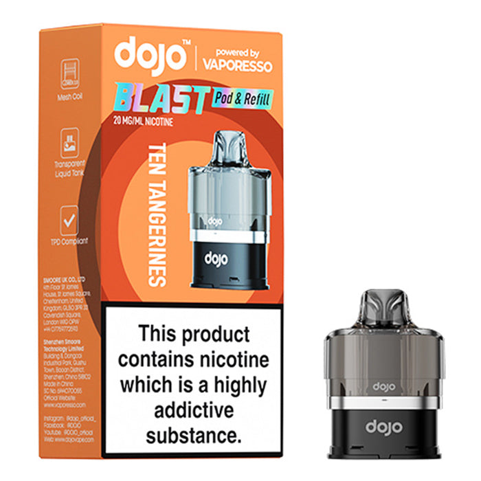 Experience the DOJO Blast 6000 Pod & Refill in Ten Tangerines, designed for smooth MTL vaping with a 2ml prefilled pod and a 10ml refill bottle of 20mg nic salt e-liquid. Featuring the advanced Corex 2.0 mesh coil, it delivers up to 6000 puffs with consistent flavour and satisfying throat hit. Ideal for vapers seeking long-lasting performance and a vibrant citrus taste.