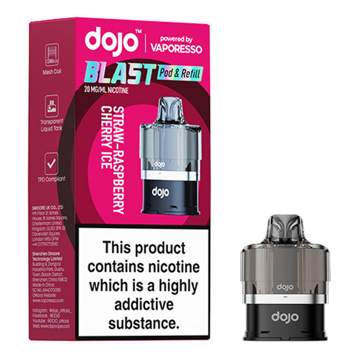 Experience the DOJO Blast 6000 Pod & Refill in Straw-Raspberry Cherry Ice, designed for smooth MTL vaping with a Corex 2.0 mesh coil. This set includes a 2ml prefilled pod and a 10ml e-liquid container featuring 20mg nic salt for satisfying throat hits. Offering up to 6000 puffs, it delivers consistent flavour and vapour production, ideal for extended use without frequent refills. Perfect for vapers seeking a balanced blend of fruity freshness and icy coolness with reliable performance.