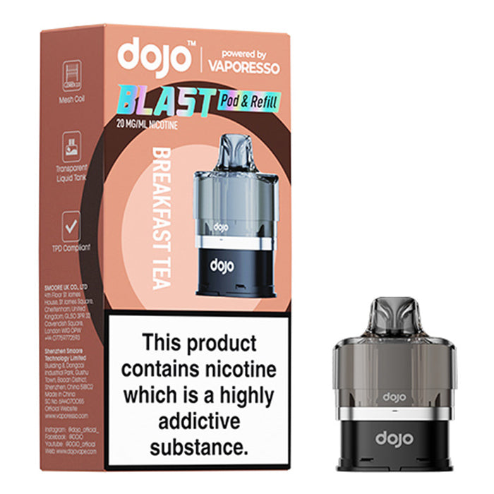 Experience the DOJO Blast 6000 Pod & Refill in Breakfast Tea flavor, designed for MTL vaping with a smooth corex 2.0 mesh coil. Each 2ml prefilled pod and 10ml refill bottle contain 20mg nic salt e-liquid, delivering up to 6000 puffs. This setup ensures consistent flavor and satisfying nicotine delivery, ideal for vapers seeking a long-lasting, convenient option with a rich breakfast tea taste.