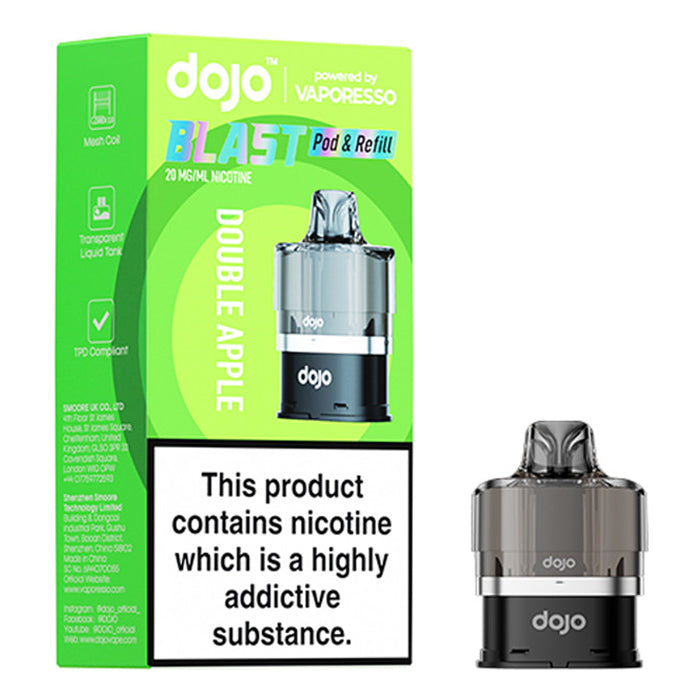 Experience the DOJO Blast 6000 Pod & Refill in Double Apple, designed for MTL vaping with a smooth 20mg nic salt e-liquid. This set includes a 2ml prefilled pod and a 10ml refill bottle, both featuring the advanced Corex 2.0 mesh coil for consistent flavour and vapour production. Offering up to 6000 puffs, it delivers long-lasting satisfaction with rich apple notes, ideal for vapers seeking a reliable and flavourful nicotine experience.