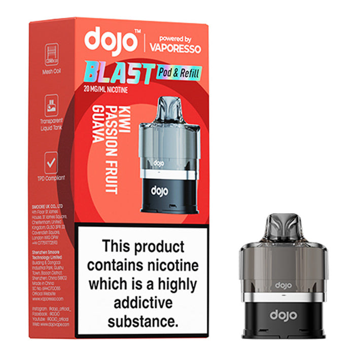 Experience the DOJO Blast 6000 Pod & Refill in Kiwi Passion Fruit Guava, designed for mouth-to-lung vaping with a smooth Corex 2.0 mesh coil. Each 2ml prefilled pod and 10ml refill bottle contain 20mg nic salt e-liquid, delivering up to 6000 puffs. This setup ensures consistent flavour and satisfying nicotine delivery, ideal for vapers seeking a reliable, long-lasting device with vibrant tropical notes.