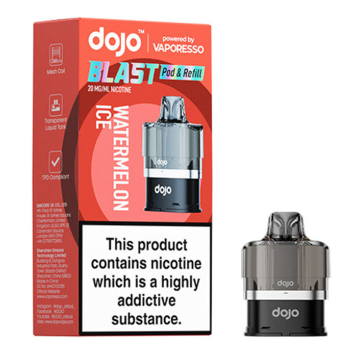 Experience the DOJO Blast 6000 Pod & Refill in Watermelon Ice, designed for smooth MTL vaping with a Corex 2.0 mesh coil. This set includes a 2ml prefilled pod and a 10ml e-liquid container, both containing 20mg nic salt for satisfying throat hits. Offering up to 6000 puffs, it delivers long-lasting flavour and consistent vapour production, ideal for vapers seeking convenience and performance in one package.